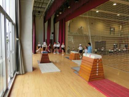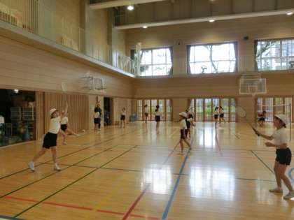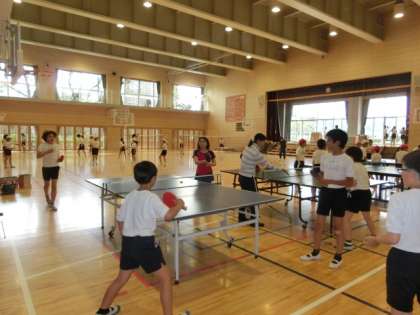 体育館では、器械体操クラブとバトミントンクラブ、卓球クラブが活動しています。卓球クラブには地域の卓球クラブの方が毎回指導に来てくださっています。