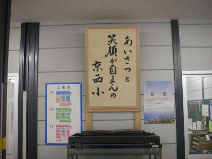 「あいさつと笑顔が自まんの京西小」の看板?、額が昇降口入口に設置されました。「ありがとうで生み出そうやさしい心」とともに京西小の合言葉です。