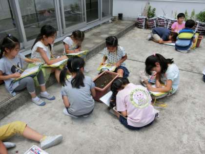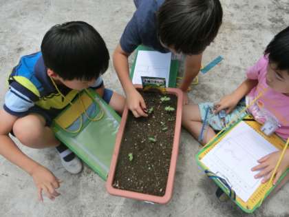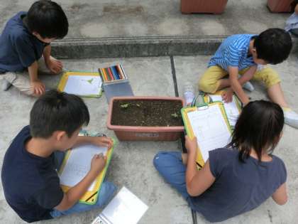 3年生は4階のベランダでヒマワリとホウセンカを育てて生長の様子を観察をしています。