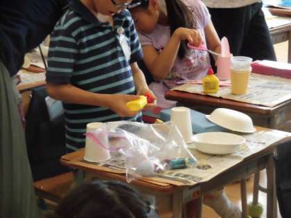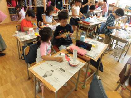 2年生はビー玉やロールを使ってコロコロ動くおもちゃを作りました。紙コップや空き箱を組み立ててウサギやカメ、車などを作りました。