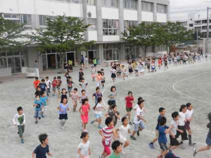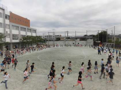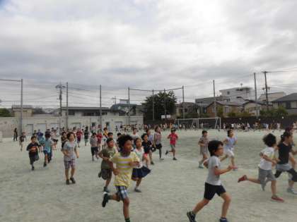 自分のペースで5分間走り切ることが目標です。だいたいの子どもがトラックを8から9周走りました。