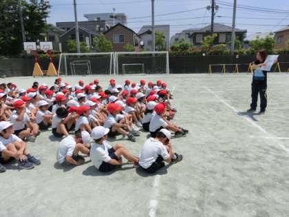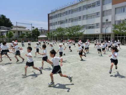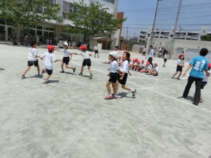 3時間目の体育では「3色おにごっこ」をして頭と体を動かしました。ルールは1組は3組を、3組は4組を、4組は1組を追いかけるというものです。自分が追いかけながら、友達に追いかけられるのでなかなか難しいおにごっこです。