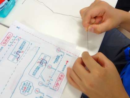手縫いの学習が始まりました。針と糸の扱いに苦戦しながらも、集中して取り組みました。「玉結び」「玉どめ」の基礎基本から、「ボタンつけ」「縫い方」を学習していきます。何度も練習すると、だんだん上手になってきました。