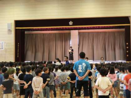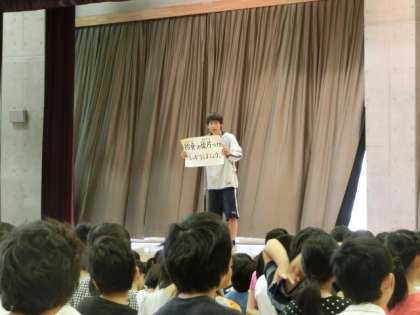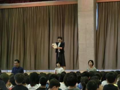 今朝は校長先生が近所にお住まいの方からいただいた手紙を紹介されました。手紙の内容は、植木鉢を割ってしまった京西小の子がインターフォンを押して正直に謝ってくれたことに対するお礼でした。このように正直な子どもが京西小にいることはとてもうれしいことですね。看護当番の田中先生からは今週の目標についてのお話がありました。