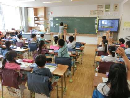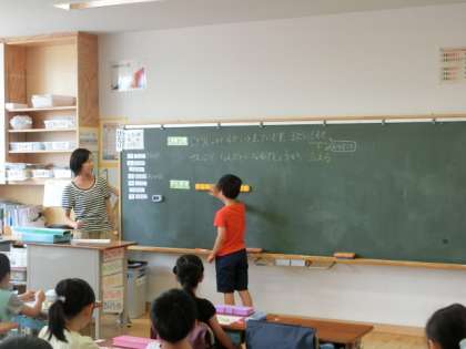 算数では足し算の勉強をしています。「車が4台あります。後から3台来ました。あわせていくつでしょう。」という問題をみんなで考えました。