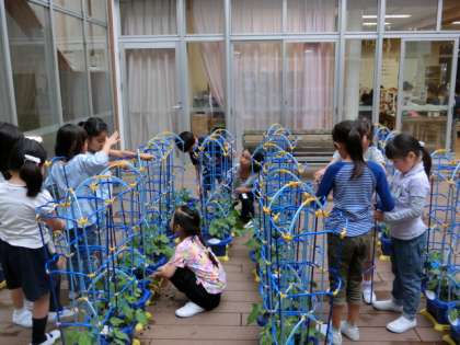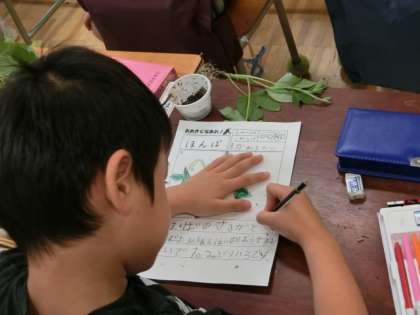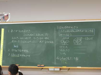 双葉と比べて本葉の形や大きさなどの違いに気付いて観察カードに上手にまとめていました。アサガオと同じように1年生もぐんぐん生長しています。
