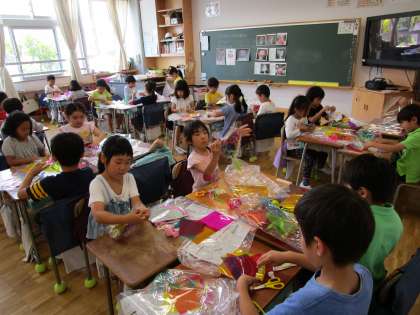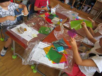 1年生は今週、すき通るセロファンやキラキラ光るシートを使って
