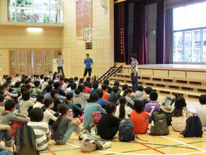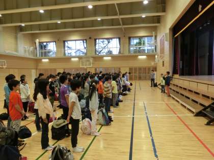あいにくの天気の中、5年生はいつもより早起きをして登校して7時30分から体育館で出発式を行いました。初めての移動教室で緊張している子どもいるようでした。林先生から「励まし合い」「助け合い」「学び合い」の3つの「合い」を大切にするようにお話がありました。