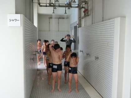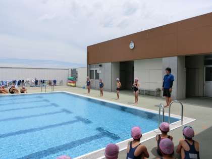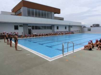 今年で3回目のプール開き。代表の児童が今年度の水泳の目標を立派に発表しました。プール開きの式が終わった後は温水シャワーを浴びました。