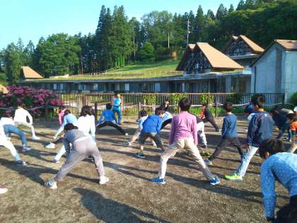 青空のもと、体操です。キャンプファイヤーで盛り上がったので、声がでにくい子が続出です。