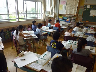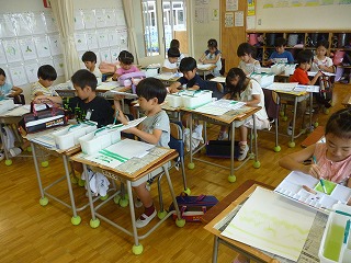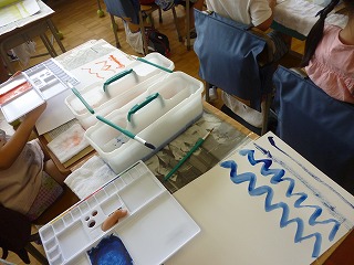 小学校で初めて絵の具を使いました。用意の仕方、筆の使い方、片付けの仕方を中心に学習しました。今回は、直線や曲線、点などを描きました。これからの図工の学習が楽しみです。