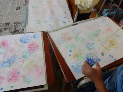 石けん水と絵の具で色シャボン水を作り、長くつないだストローで泡立たせました。泡の形を画用紙に写して模様作りを楽しみました。