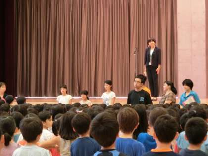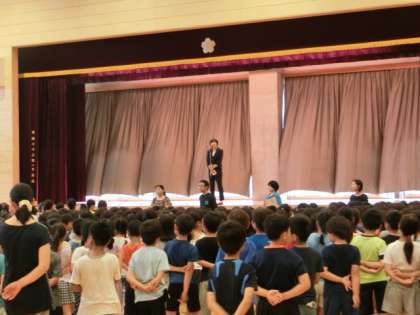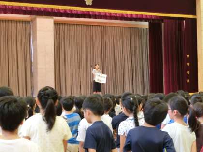 当番の6年生が全校児童に向かって一言スピーチをしてから児童朝会が始まります。今日の6年生は「みなさん水泳を頑張りましょう」という話をしました。校長先生からは、暑さに負けない体を作るために汗をたくさんかくことと水分補給をしっかりしましょうというお話がありました。看護当番の先生からはみんなが気持ちよく生活するために学校のきまりを守ることの大切さについてお話がありました。