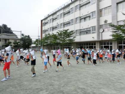 今日は給食室からの出火を想定した訓練です。南階段が使えないので音楽室の脇にある非常階段からも避難しました。いつもとはちがう避難経路を通りましたが先生の指示に従いスムーズに避難することができました。
