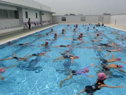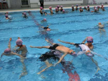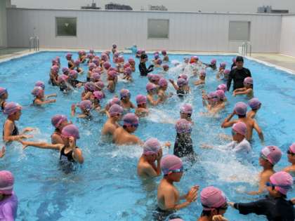 今日は着衣したまま川や海に落ちたときの対処の仕方を学ぶ着衣泳を行いました。まずは、水着で浮いたり、泳いだりした時の感覚を覚えました。