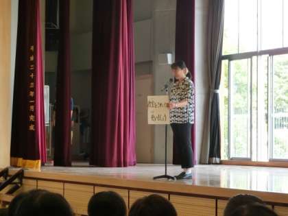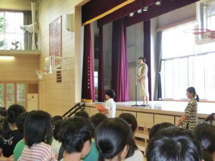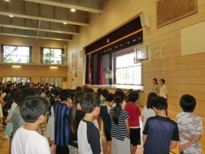 今朝の児童朝会では、校長先生の「節子」というお名前の由来を伺いました。そこから自分や友達の名前を大切にしましょうという人権意識を涵養させるお話を伺いました。なお、由来は親族の中で一番健康な方のお名前から一文字いただいたということでした。看護当番の先生からは夏休み前に「教室をきれいにしましょう」というお話がありました。