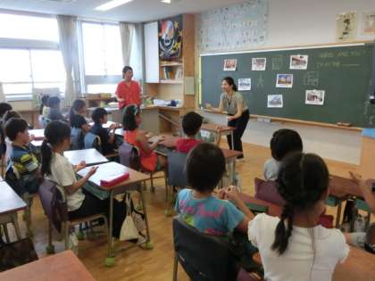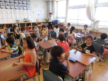 「トン、トン、トン、トン」と手拍子のリズムに合わせて、友達同士で尋ね合いました。英語で応答することとリズムに合わせることを同時に行うのはちょっと難しそうでした。。。今日は、世田谷区の英語教育推進リーダーの先生と教育委員会の指導主事の先生に授業を見ていただきました。授業後に辻岡先生とサンディー先生の連携が素晴らしいとお褒めの言葉をいただきました。