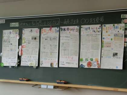 5年生は、米作りについて学習しています。教科書や資料集等を使って米作りの現状と課題、工夫などを学びました。そして、課題解決のために考えたことを南魚沼の稲作農家の今井さんに伝えるために班でまとめました。