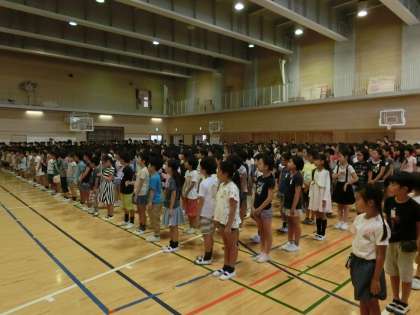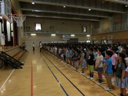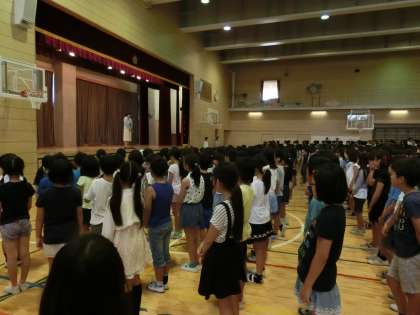 今朝は、1学期の終業式を行いました。校長先生から脳を活性化させるセロトニンという体内物質の話を伺いました。これは朝に日光を浴びることで分泌される物資です。夏休み中も規則正しい生活に心がけて日光を浴びて脳を活性化させましょうというお話でした。