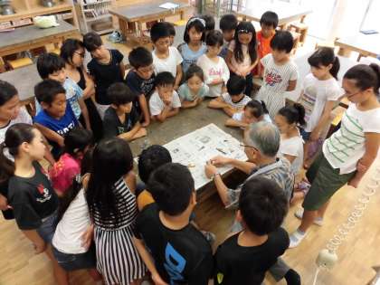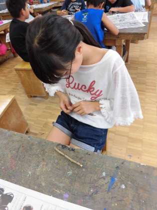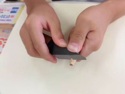 前校長先生の箭内先生の講座です。子どもたちは慣れない小刀を使って、慎重に木の枝を削って仕上げました。