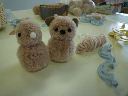 毛糸をくるくると巻いて、チョキッと切って、形を整えると、、、なんと可愛いウサギさんとクマさんが出来上がりました!