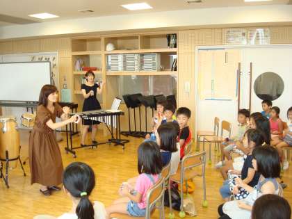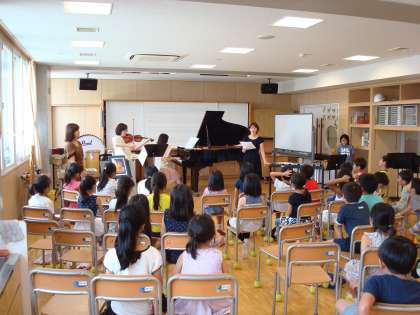 音楽室では、1,2年生を対象に「アニメソング」を中心に演奏を聴いたり、音楽に合わせて音楽室の楽器を演奏したりしました。知っている曲も多く、演奏を聴きながら一緒に歌いました。