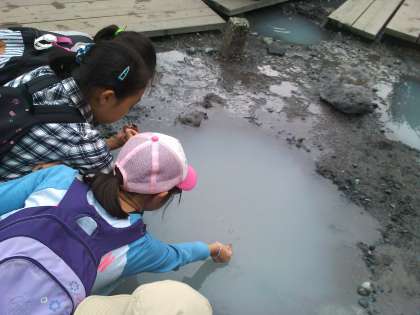 最後に湯元温泉の源泉に行きました。十円玉の実験中です。