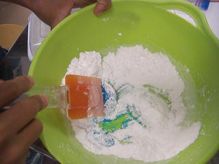粉砂糖、コーンスターチ、クエン酸、重曹などを使ってラムネ菓子を作りました。食紅で色をつけて、おいしいラムネができました。