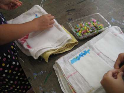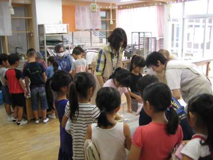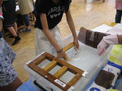 牛乳パックで作った原料から、紙をすく体験をしました。冷たくてべちょべちょした原料を触り、「なんか変な感触だ」と始めはびくびくしていましたが、みんな真剣に取り組みました。紙がすけたら、お花紙で飾りを付けました。世界に1つしかない、オリジナルの紙が出来ました。あとは家で窓などに貼り付け、乾燥させたら完成です。