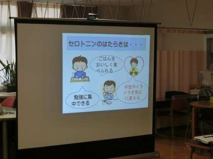 今日は6年生が保健室で発育測定と保健指導を受けました。勉強に集中できる、心が安定する等の効果がある体内物質「セロトニン」の話題は、思春期にさしかかっている6年生にはとってもタイムリーです。みんな集中して聞いていました。健康カードの裏の折れ線グラフを記入するのもあと2回。子どもたちの成長の軌跡をご家庭で一緒に確かめてください。