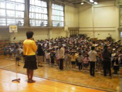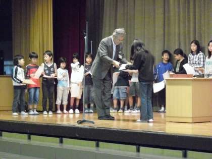 27日は全校朝会です。今日は、俳句名人の表彰です。1学期に2年生以上の子どもたちが全員俳句を作りました。その中からクラス2名の俳句が俳句名人として表彰されました。表彰された俳句は短冊に書かれ、1年3組の前の壁に掲示されています。なかなか楽しい句がありました。2学期も皆で作ります。