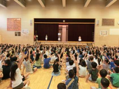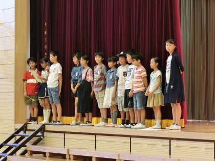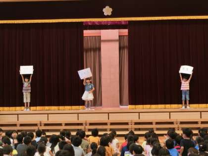 集会委員会の子どもたちが企画した「何が通ったかな?」クイズをみんなで楽しくやりました。舞台の幕の間を何が通ったかを見極めて3択から答えを選びました。「よっきーくん」人形はみんな正解していましたが、「6年生」は「5年生かもしれないなあ」と悩んでいる子が多かったです。ゲームが終わった後、上半期の児童集会で毎回楽しいゲームを企画してくれた集会委員会にみんなでお礼を言いました。