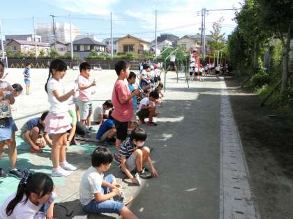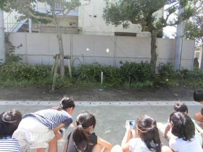 校庭で日光を鏡に当てて光の性質を調べました。前回の学習では、みんなが同じ鏡に当てていたので誰がどの光を調べているのか分かりませんでした。そこで、今日は自分で星形やハート型などに切り抜いた紙や色が付いたセロファンを鏡に被せて違いが分かるように工夫しました。トライ&エラーを繰り返すことで思考力も鍛えられました。