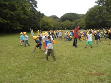 そのあとの、「手つなぎ鬼」も、緑の芝生の上を元気よく駆け回っていました。