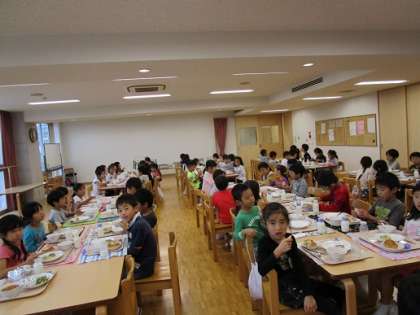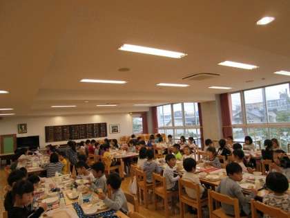 いつもより大きな机で、たくさんのお友達と食べる給食は格別でした。