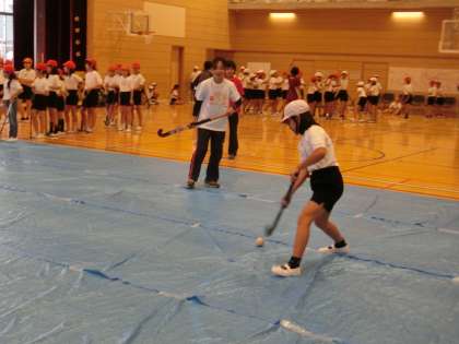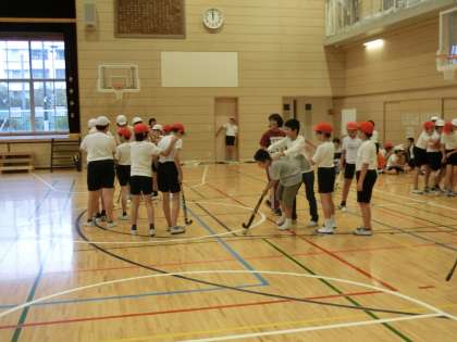 5,6年生にはそれぞれ1時間ずつ実技指導をしてくださいました。スティックとボールに初めて触る子どもたちでもホッケーに親しめるよう「ドリブルジャンケン列車」と「パス&シュート」をしました。変わった形をしたスティックの先でボールを扱うのはなかなか難しそうでしたが、みんなたのしそうにやっていました。