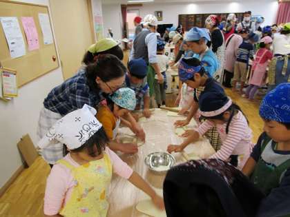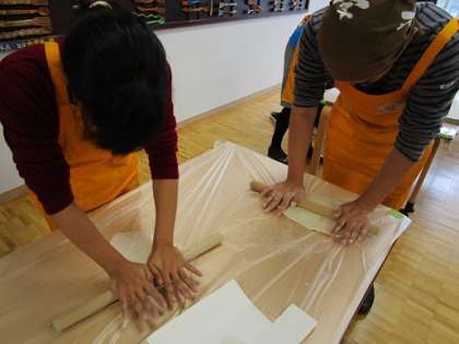 力の入れ方が難しい麺棒ですが、夢中で生地を伸ばしています。