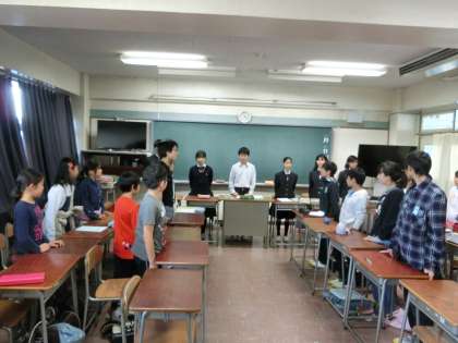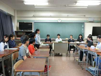 「ようがの学び舎」では毎学期3校の生徒会役員が用賀中生徒会室に集合して自分たちの学校生活をよりよくするために話し合っています。今日のテーマは「おはようコミュニケーション(あいさつ運動)」でした。今までよりも3校の生徒会が協力できる体制を作ろうという話を用賀中の生徒会長から提案され、みんなで議論をしました。最終的に学校間でポスターを交換して励まし合おうということになりました。