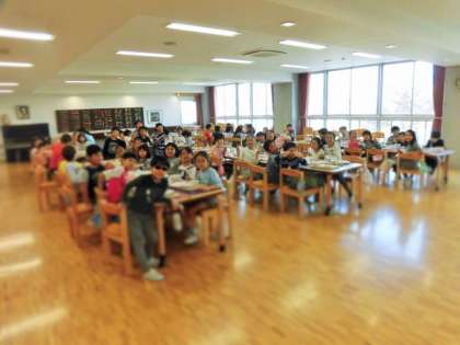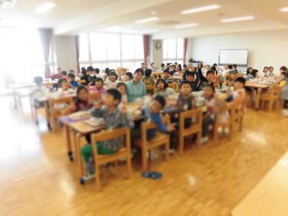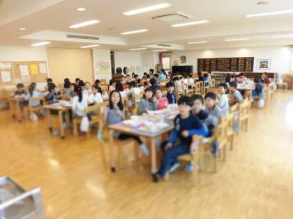 本日は、多目的室をランチルームとして使った交流給食でした。子供たちは、場所が変わるだけでもとにかく楽しそう♪そこに、いつもは一緒に給食を食べることのない、ほかの学級のお友達までいるものですから、みんな笑顔が弾けていました!