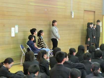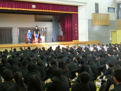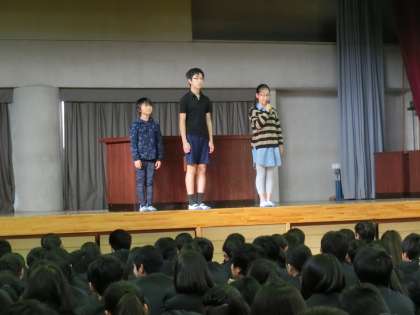 今朝は、児童会長・副会長が用賀中の朝会でワンダーランド展覧会の広報をしてきました。小学校との雰囲気や体格、洋服の違いから舞台上では少し緊張していましたが、発表後に温かい拍手をもらえてほっとした様子でした。中学生にも是非見に来てほしいものです。