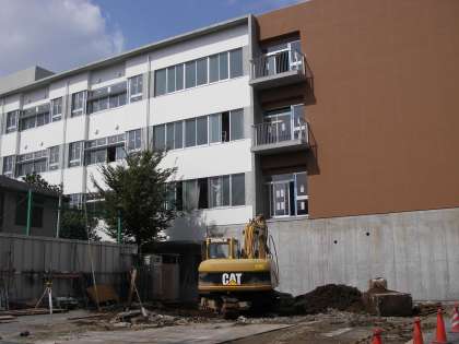 6日、工事中の校舎に案内していただきました。工事は順調に進んでいます。南側の足場はなくなりました。建築事務所も撤去されています。そこにBОPの建物を建てるように準備が進んでいます。屋上のプールも出来上がりつつありました。教室の中もロッカーが設置されています。4階、屋上からは富士山も見えます。完成がとても待ち遠しく思います。