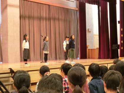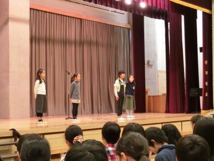 1年のまとめと進級の準備をする3学期が始まりました。校長先生からも「1つ上を目指しましょう。」というお話がありました。児童代表の言葉は3年生です。各クラスから選ばれた子が2学期に頑張った「元気なあいさつ」や「短縄跳び」、「毎月自分で目標を決めて着実に達成すること」をさらに発展させたいという抱負を発表しました。
