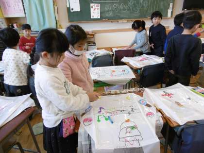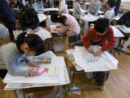 自分で作ったオリジナルのたこを上げて、お正月を楽しみます。今日はたこの足をつないで、好きな絵をクレヨンで大きくかきました。自分のたこが空に上がる日をみんな楽しみにしていました。天気がいい日に上げたいですね。