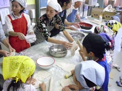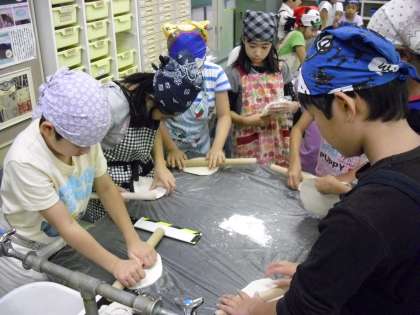 ねって、踏んで、伸ばして、切って・・・。みんな一生懸命に麺を打ちました。