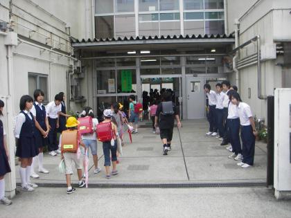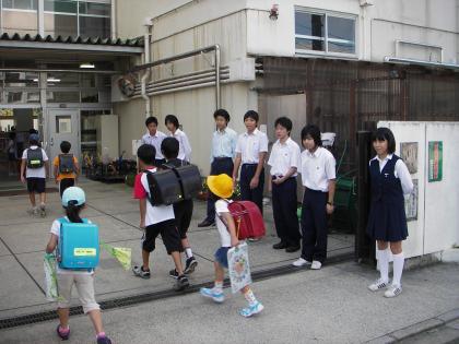 京西小学校には、朝早くから用賀中学校の生徒会の人たちが来てくれて、門に立って子どもたちを迎えてくれました。ひときは大きな声の挨拶が響き渡りました。