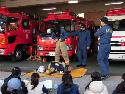 たくさんの消防士さんたちがお忙しい中車両や所内を見せてくださり、また、子供たち一人一人の質問にも丁寧に答えてくださいました。