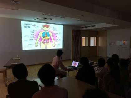 6年生が多目的室に集まり、薬物乱用防止教育を受けました。講師は学校薬剤師の赤川先生です。