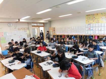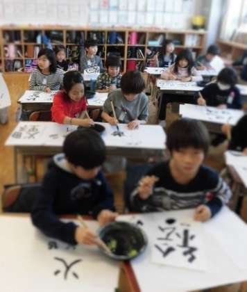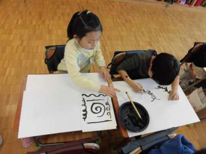 日本語の学習で、筆を使って墨で自分の書きたいものを書きました。筆を使って書くことが初めての子どもも多く、とても興味深く取り組んでいました。