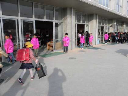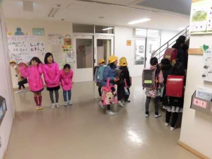 外でやりたいと言う子、階段の下でやりたいと言う子。それぞれの思いがあるようですが、今日もしっかりがんばりました。目の前を通るお友達に、朝一番に元気パワーを注入です!!