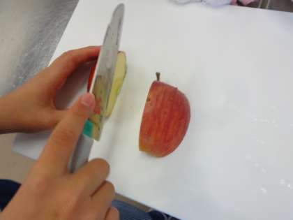 これまでの家庭科の学習を生かして、お世話になった人たちへの感謝の気持ちを表したり、伝えたりする方法を考えました。今日は、調理の学習を生かして「フルーツ白玉」「もっちりどら焼き」を作りました。小学校生活最後の調理実習でしたが、手順をしっかり理解して、楽しみながら調理に取り組みました。
